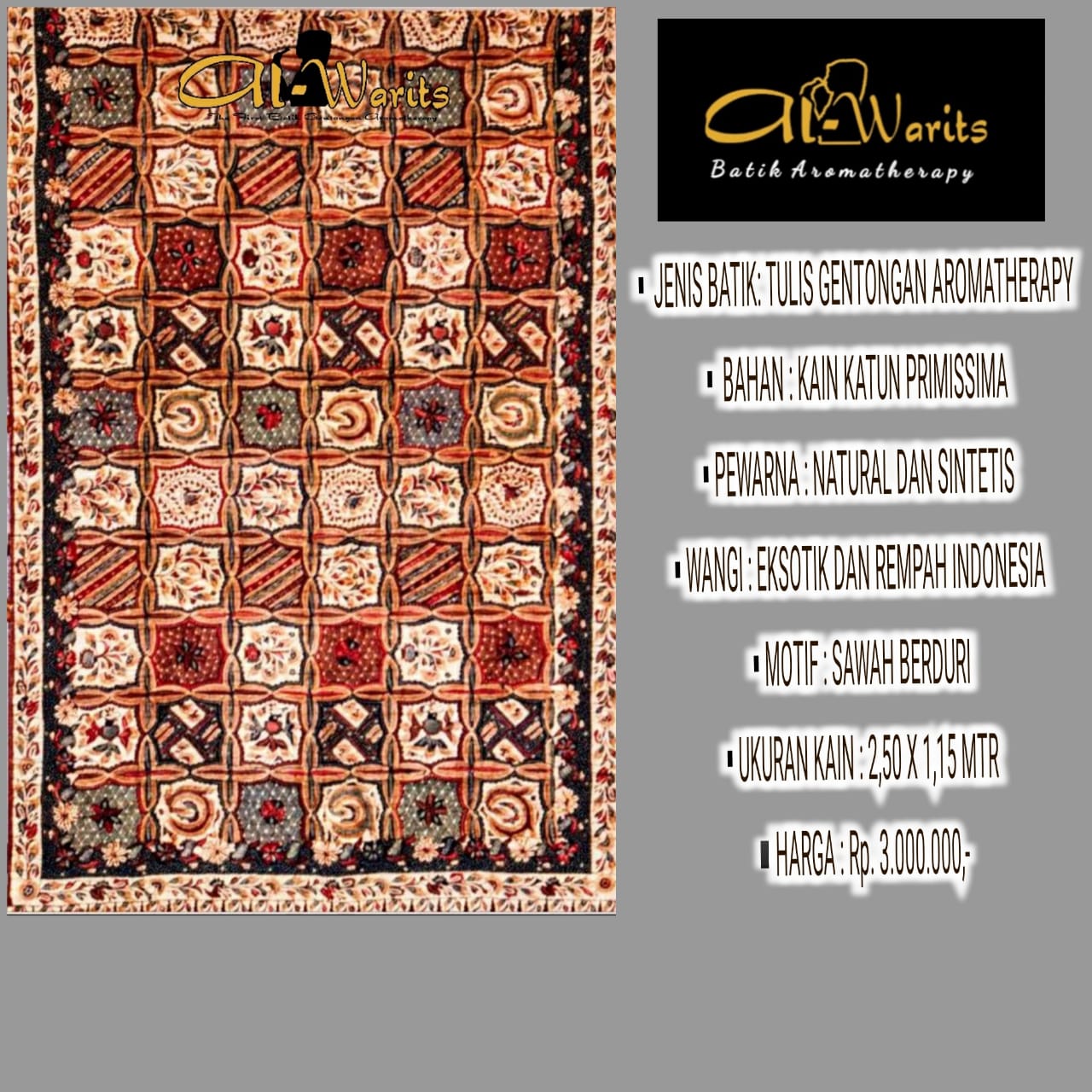 Dari Hati kami di Alwarits Batik Aromatherapy, kami menghadirkan kain Batik Madura yang bukan hanya indah dipandang, tetapi juga membawa kehangatan dan ketenangan melalui aroma yang menyejukkan dalam setiap helainya